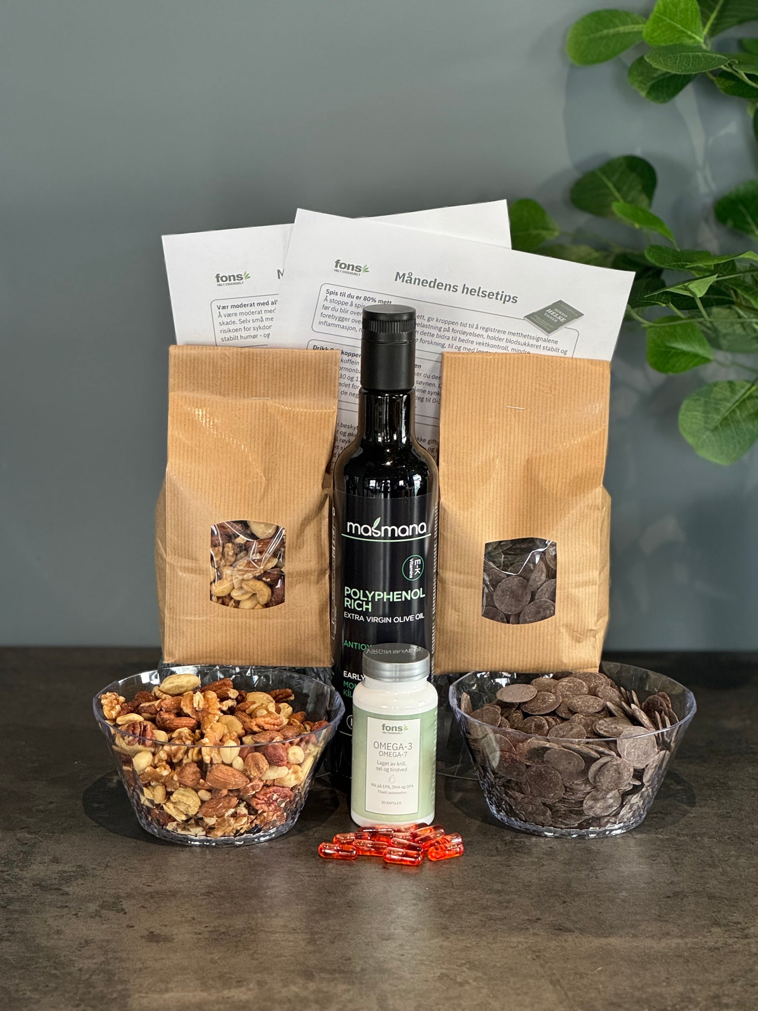Fons gir deg månedlige leveranser av mørk sjokolade, ferske nøtter, olivenolje og omega-3. Satt sammen for å styrke helsen din og samtidig gi deg små øyeblikk av luksus.
