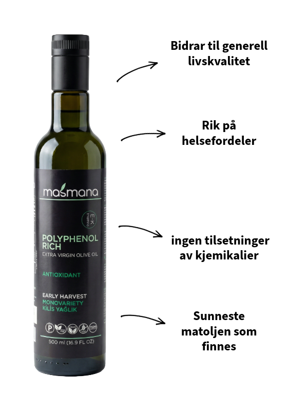 Disse stoffene arbeider sammen for å forbedre hjertet og blodårene, dempe betennelse og beskytte mot kroniske sykdommer. I tillegg fremmer olivenolje hudens helse, forsinker aldring og støtter en sunn og balansert livsstil.